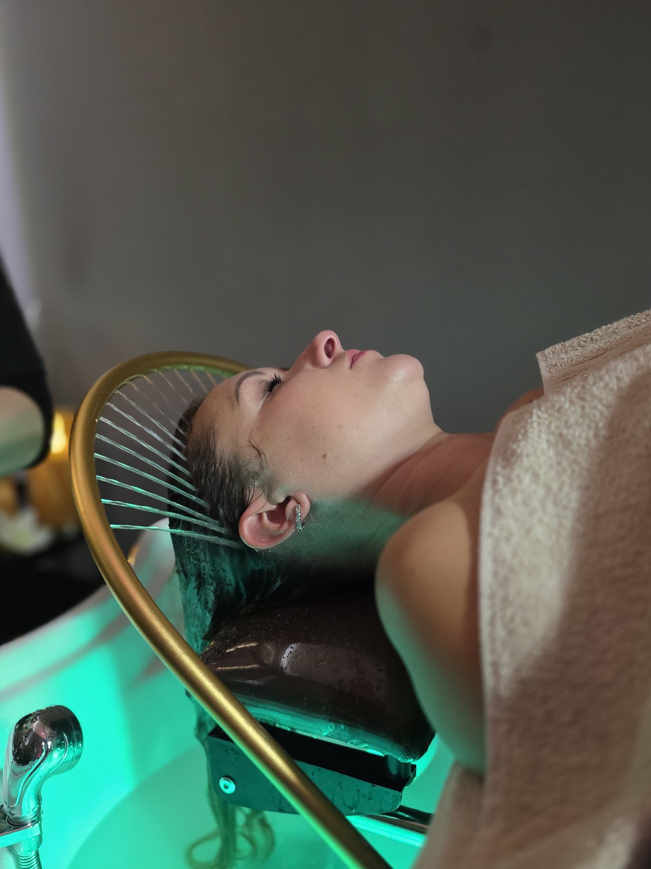 3. Vodní terapie & Masáž Vrchol celého zážitku. Zatímco vám na vlasy proudí teplá voda z relaxačního prstence ("Water Halo"), provádíme dlouhou, pomalou masáž hlavy. Kombinace zvuku tekoucí vody a rytmických doteků uvolňuje svalové napětí, migrény a stres nahromaděný v šíji. Je to moment, kdy většina klientů přechází do stavu hluboké relaxace či spánku.