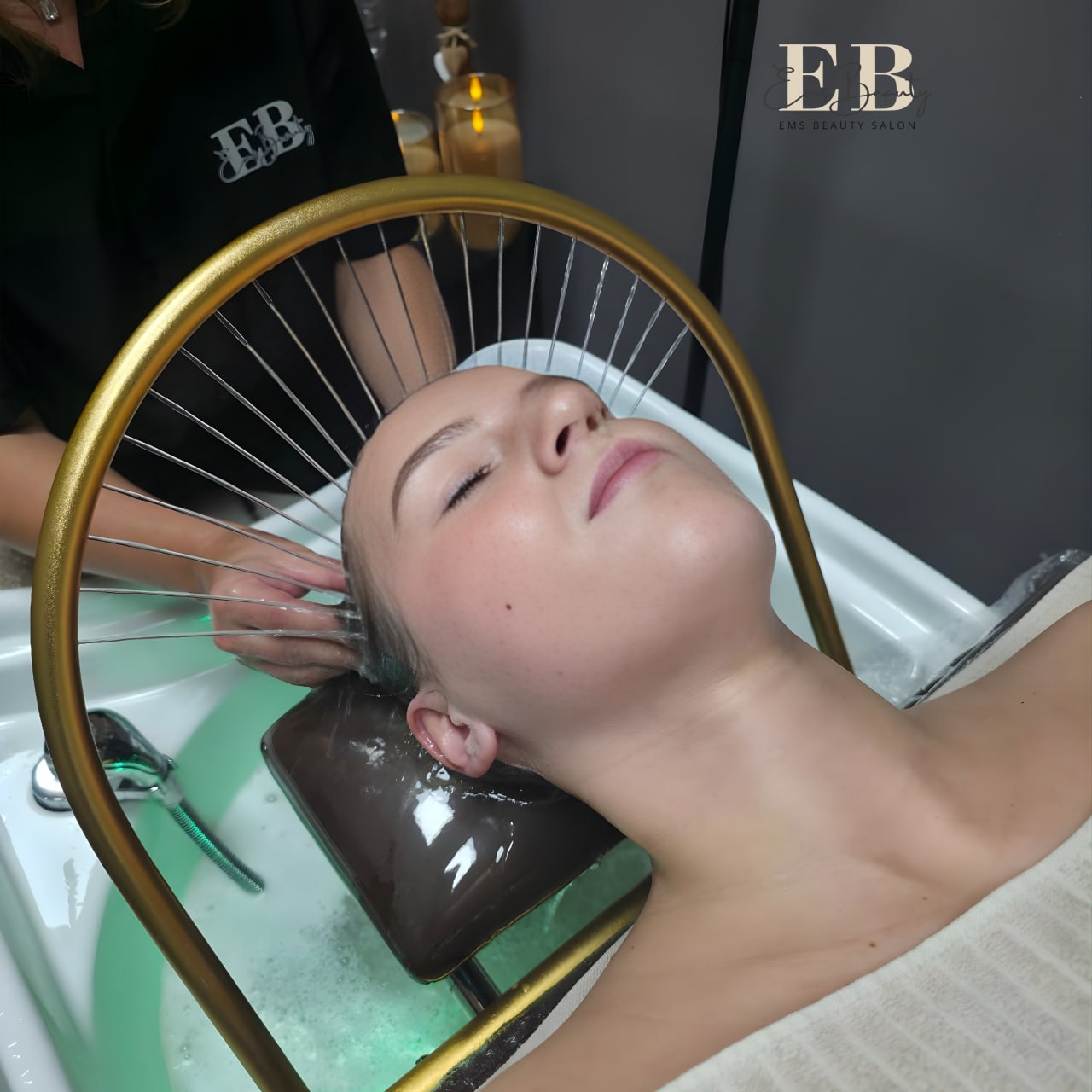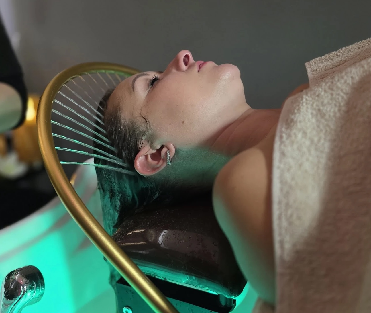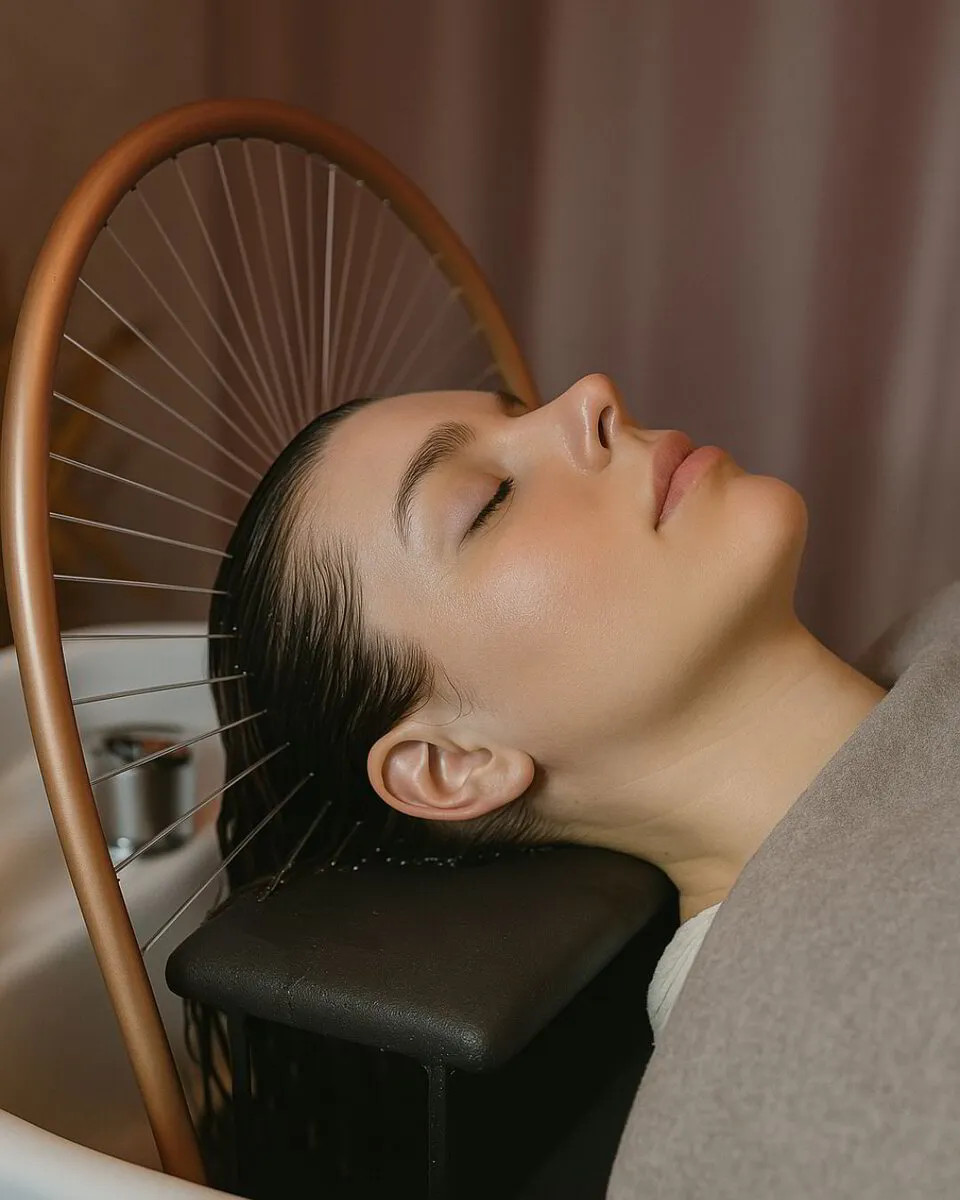 3. Vodní terapie & Masáž Vrchol celého zážitku. Zatímco vám na vlasy proudí teplá voda z relaxačního prstence ("Water Halo"), provádíme dlouhou, pomalou masáž hlavy. Kombinace zvuku tekoucí vody a rytmických doteků uvolňuje svalové napětí, migrény a stres nahromaděný v šíji. Je to moment, kdy většina klientů přechází do stavu hluboké relaxace či spánku.