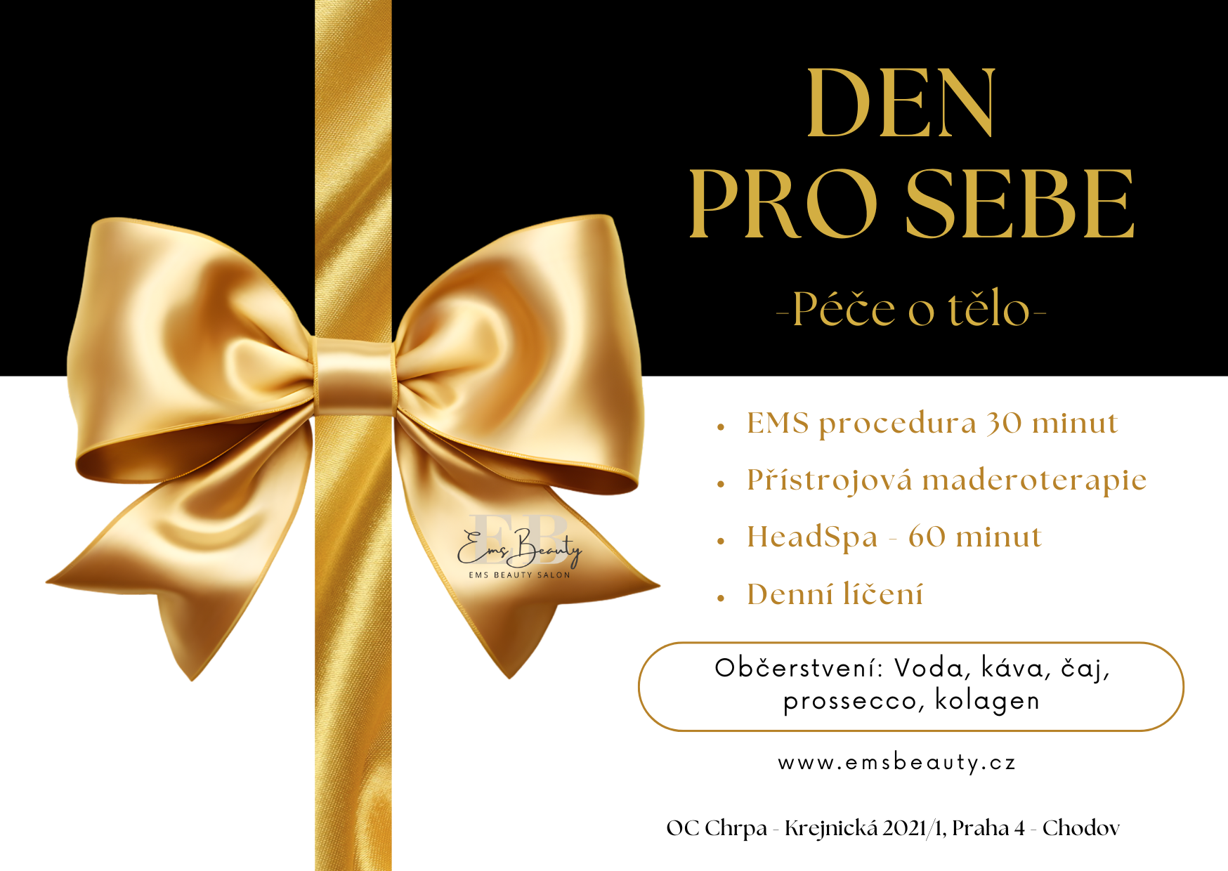 Dárkový balíček - Den pro sebe - Kompletní péče o tělo. Zahrnuje EMS proceduru na jednu Vámi zvolenou partii na 30 minut. Přístrojovou maderoterapii na 30 minut na Vámi zvolené partie. Japonskou relaxační terapii HeadSpa na 60 minut, zakončenou denním líčením.